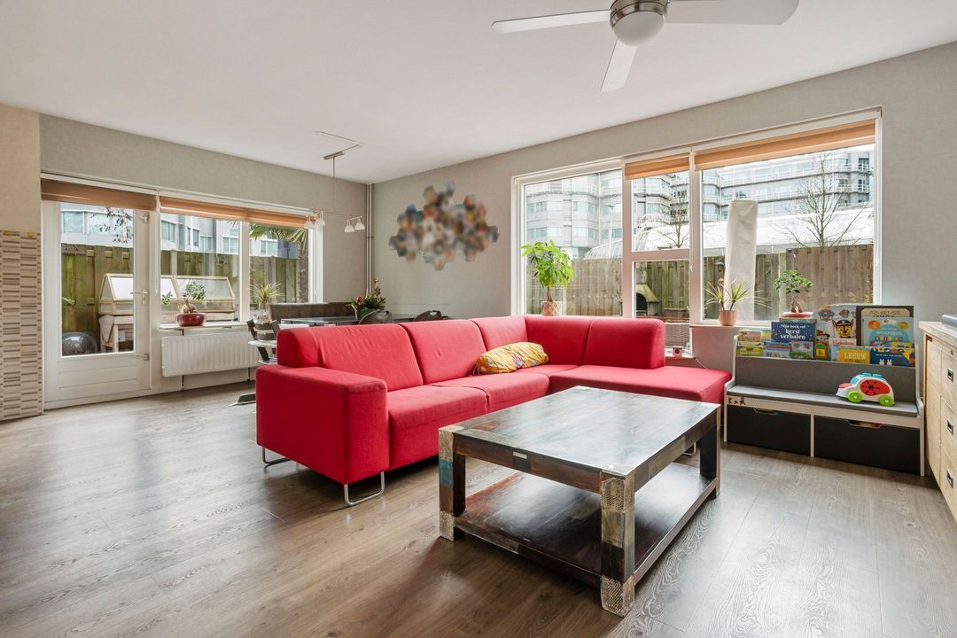 De ruime woonkamer is heerlijk licht dankzij de grote raampartijen aan de zij- en achterzijde.